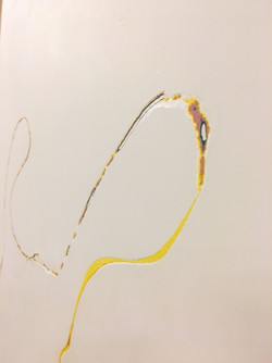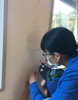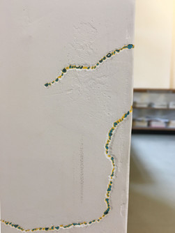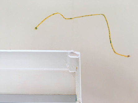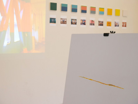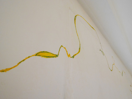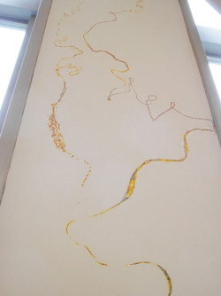 ひとり30㎝ 延べ約200人の参加により、ロビーの壁に色の層を含んだ線が少しずつ拡がっていきました。